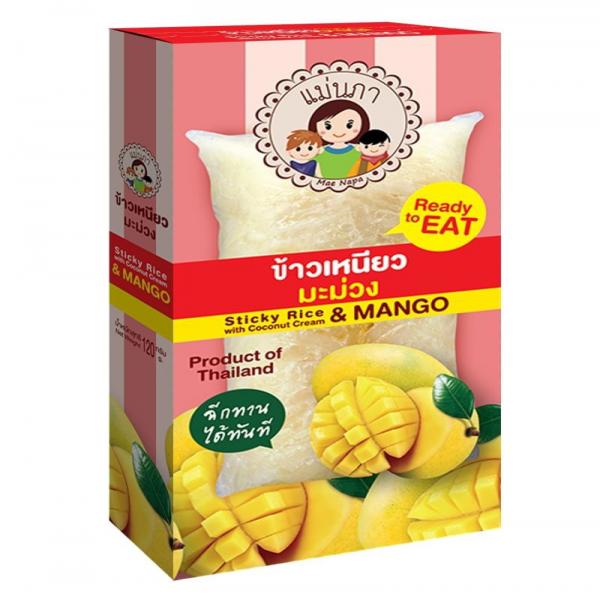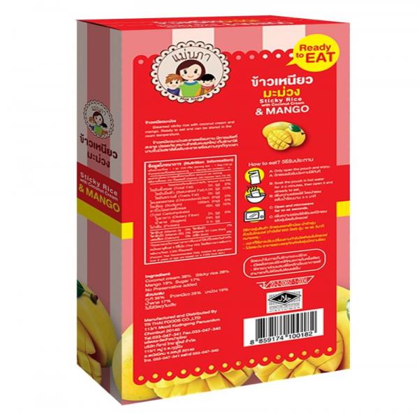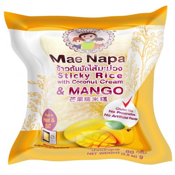 เป็นข้าวต้มมัดที่ผ่านการนึ่งแรงดันสูงเนื้อนุ่มสีน้ำตาลอ่อนสอดไส้มะม่วง รสชาติหวานมัน