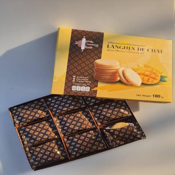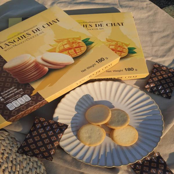 คุกกี้วงกลมบางกรอบ ที่หอม กรอบนุ่ม ละลายในปาก สอดไส้ด้วยช็อคโกแลตมะม่วง อย่างเต็มคำ