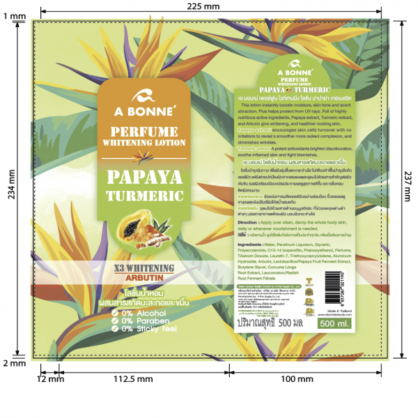 เพอร์ฟูม ไวท์เทนนิ่ง โลชั่น ปาปาย่า เทอเมอริค (ขวดพลาสติกหัวปั๊ม ขนาดบรรจุ 500 มิลลิลิตร และขวดพลาสติกฝาฟลิบทองขนาดบรรจุ 300 มิลลิลิตร)