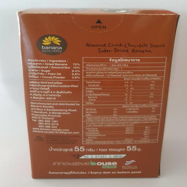 กล้วยตากพลังงานแสงอาทิตย์ช็อกโกแลตอัลมอนด์ ตราบานาน่าโซไซตี้ 55 กรัม