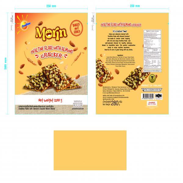 แผ่นเครกเกอร์สี่เหลี่ยมทาด้วยน้ำปรุง โรยด้วย เฟล็คโอวัลตินและอัลมอนด์ มีรสชาติหวานและมีกลิ่นหอม