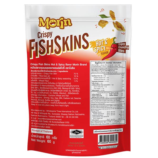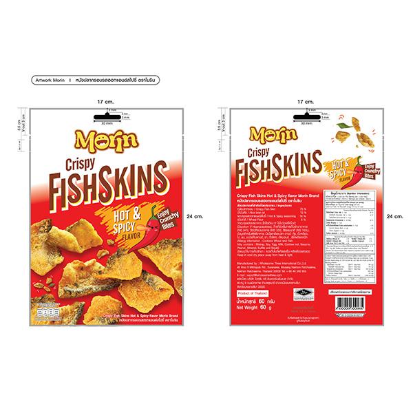 หนังปลาทอดกรอบปรุงรส รสชาติเค็ม กลมกล่อม มีกลิ่นหอมของเครื่องเทศของผงปรุงรสฮอทแอนด์สไปซี่