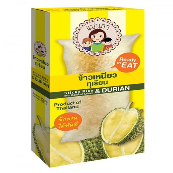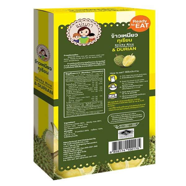 เป็นข้าวต้มมัดที่ผ่านการนึ่งแรงดันสูงเนื้อนุ่มสีน้ำตาลอ่อนสอดไส้ทุเรียน รสชาติหวานมัน