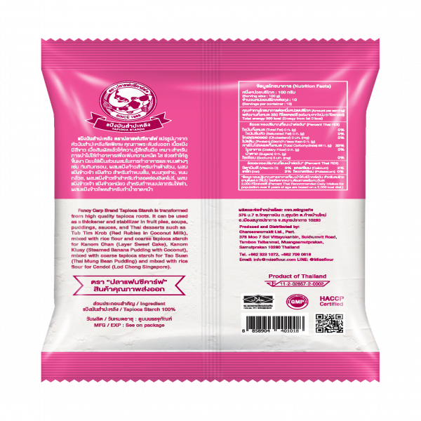 แป้งมันสำปะหลัง ตราปลาแฟนซีคาร์ฟ แปรรูปมาจากหัวมันสำปะหลังคัดพิเศษ คุณภาพระดับส่งออกเนื้อแป้งมีสีขาว เมื่อสัมผัสแล้วให้ความรู้สึกลื่นมือ เหมาะสำหรับการนำไปใช้ทำอาหารเพื่อเพิ่มความหนืด ใส และช่วยทำให้ดูขึ้นเงา นิยมใช้เป็นส่วนผสมในการทำอาหารและขนมต่างๆ เช่น ทับทิมกรอบ, ขนมผิง , เต้าส่วน, ผสมแป้งข้าวเจ้า แป้งข้าวโพด สำหรับทำขนมชั้น, ผสมแป้งข้าวเจ้าสำหรับทำลอดช่องสิงค์โปร์ ขนมกล้วย, ขนมกุยช่าย , ผสมแป้งข้าวเจ้า แป้งข้าวเหนียวสำหรับทำขนมปลากริมไข่เต่า, ผสมแป้งข้าวโพดทำน้ำราดหน้า