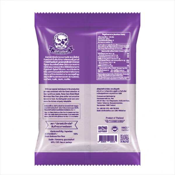 ด้วยเทคนิคพิเศษในกระบวนการผลิตและเมล็ดพันธุ์ข้าวเหนียวดำชั้นเยี่ยมที่ผ่านการคัดสรรมาเป็นอย่างดี ทำให้แป้งข้าวเหนียวดำ ตราปลาแฟนซีคาร์ฟ มีเนื้อสัมผัสที่นุ่มนวล เนียนละเอียดเป็นพิเศษ เมื่อนำมาประกอบอาหารจะมีกลิ่นหอมจากธรรมชาติและให้สีสันที่สวยงามที่ได้จากข้าวเหนียวดำ ซึ่งช่วยทำให้อาหารหรือขนม น่ารับประทานยิ่งขึ้น นอกจากนั้นยังอุดมไปด้วยสารอาหารอีกมากมาย มีใยอาหารที่มีประโยชน์ต่อร่างกายและมีธาตุเหล็กสูง นิยมนำไปใช้ทำขนมหลากหลายประเภท เช่น ขนมบัวลอย, ขนมถั่วแปบ, ขนมต้ม, ขนมเข่ง, ขนมเทียน, ผสมกับแป้งมันสำหรับทำขนมบ้าบิ่น, และ ผสมกับแป้งท้าวยายม่อมสำหรับทำกาละแม เทคนิคการใช้งาน เนื่องจากแป้งข้าวเหนียวดำตราปลาแฟนซีคาร์ฟ ถูกแปรรูปมาจากเมล็ดข้าวเหนียวดำแท้ 100% ถ้าหากต้องการให้มีความนุ่มมากยิ่งขึ้น ควรจะต้องผสมแป้งข้าวเหนียวขาวลงไปในสูตรด้วยอัตราส่วนโดยประมาณ 1 : 1