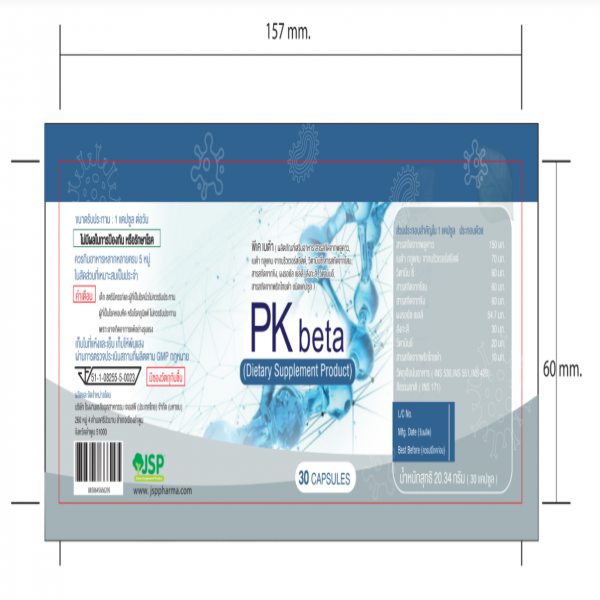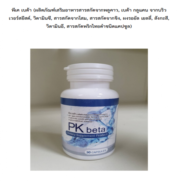 พีเค เบต้า (ผลิตภัณฑ์เสริมอาหารสารสกัดจากพลูคาว, เบต้า กลูแคน จากบริวเวอร์สยีสต์, วิตามินซี, สารสกัดจากโสม, สารสกัดจากขิง, ผงรอยัล เยลลี, สังกะสี, วิตามินอี, สารสกัดจากพริกไทยดำชนิดแคปซูล) (เครื่องหมายการค้า สุภาพโอสถ)