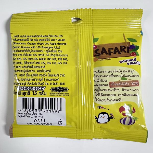 • เจลฟี่ ซาฟารี (ขนมเยลลี่เจลาตินผสมน้ำสับปะรด 10% กลิ่นสตรอเบอร์รี่ ส้ม องุ่นและแอปเปิ้ล แบบที่ 1)