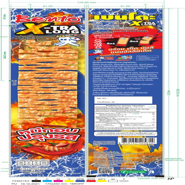 เนื้อปลาหมึกแห้ง เหนียวนุ่ม สีน้ำตาลแดง กลิ่นพริกแดง และรสชาติ เผ็ด หวาน เค็ม / ลักษณะเป็นแผ่นยาว มีลายตัดขวาง