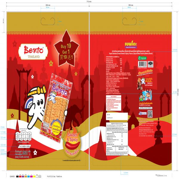 สีน้ำตาล-แดง เนื้อปลาหมึกแห้งเหนียวนุ่ม รสชาติเผ็ด กลมกล่อม กลิ่นพริกและเครื่องเทศ / ลักษณะเป็นแผ่นสั้น มีลายตัดขวาง
