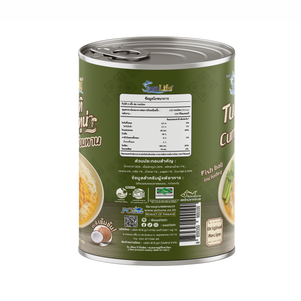 นำเนื้อปลาทูน่ามาบดผสมกับเครื่องแกง และนำเนื้อปลาที่ผสมกับเครื่องแกงเรียบร้อยแล้ว นำมาใส่ลงถังผสมที่และเติมน้ำ น้ำกะทิ และส่วนผสมอื่นๆ ต้มให้ได้อุณหภูมิ 90 องศาเซลเซียส จนกะทิแตกมัน นาน 20 นาที และนำบรรจุลงกระป๋อง ปิดฝา และนำไปฆ่าเชื้อตามอุณหภูมิ และเวลาตามที่กำหนด